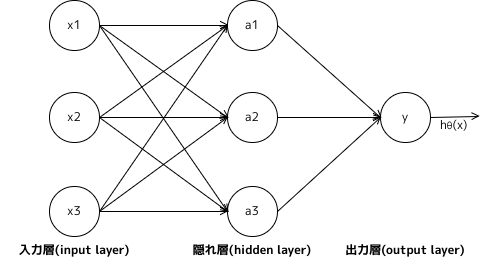 下記は、入力X($x_1$, $x_2$, $x_3$)に対して、出力Y($h_\Theta(x)$)となる3層構造のニューラルネットワークの例である。